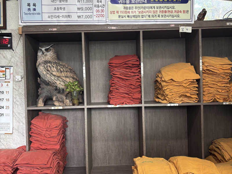というのもサウナは空いていて、皆様お目当てはチムジルバンみたい。服を着たまま入る岩盤浴のようなものです。おしゃべりしたりスマホいじったり、過ごし方は十人十色。私は文庫本持ち込んで読書してました。ほとんど熱くない部屋からほぼサウナみたいな熱い部屋まで四つほどハシゴしました。