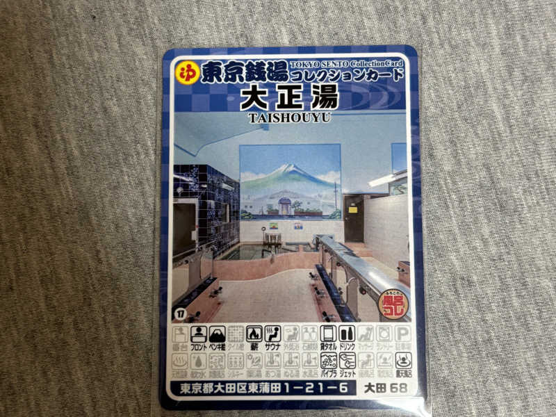 銭湯コレクションカードを買って脱衣所へ、そこから浴室のペンキ絵が見えた。大正湯の外観の奥に富士山がそびえ立つ。これは見応えがある。そういえば以前は純烈ジャーだったはず。絵になかなかこだわりがありそう。芯まで冷えた手足にあつ湯が沁みる。ペンキ絵を眺めなら体をうるかした。
