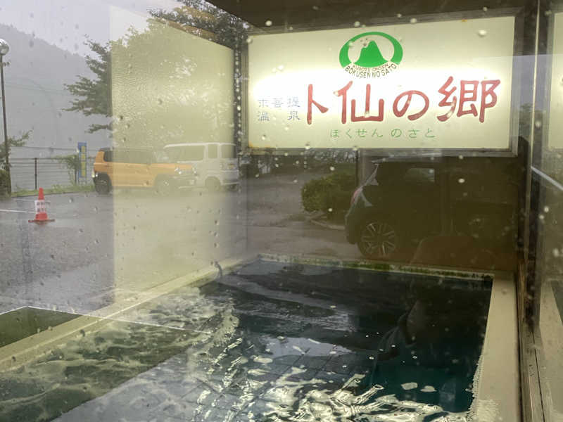 熱くなった農道に雨が降り、モクモク蒸気があがる。幻想的だ。山の方へ進むにつれ雨足が激しくなり、卜仙の湯へ到着した時、ピークだった☔️ズバーン、じゃんじゃん降り。