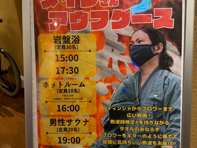 先日同県内施設にて熱波師デビューしたと言う、黒い特攻服にサンタ帽を着けたMJが入室🎅🏻