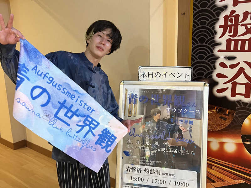 お茶噴霧からの、メイタブレンドアロマキューゲルロウリュから仕込まれたというタオル扇ぎを巧みに見せ⬜