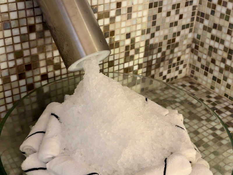 氷が用意されています。 シャワーブースは個室になっていて、奥のシャワールームと手前のベンチルームに分かれていますが、そこで休憩すると他の人がシャワーを使えません。
