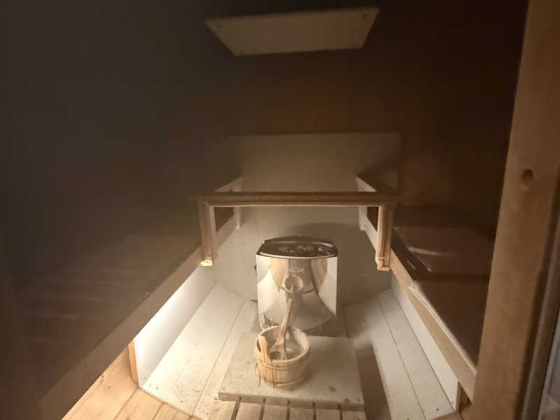 秘密基地みたいな何ともいえない空間。入った瞬間はそこまで暑くなかったが、セルフロウリュするとじんわりと暑くなってくる。心地よい加熱。