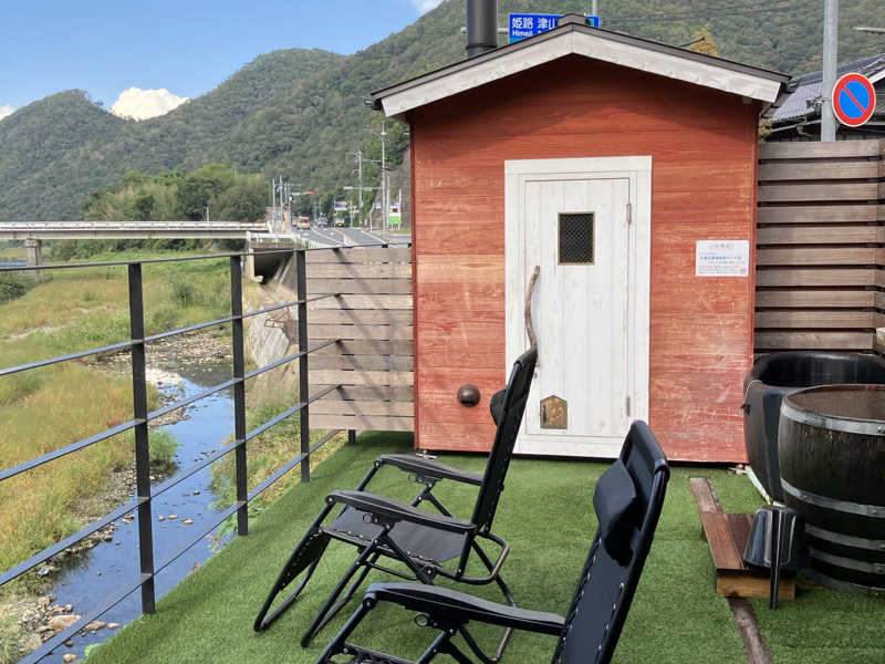 ハウスメーカーが作ったサウナということで、美作産木材を使用したサウナ小屋、セルフロウリュできる薪ストーブ、ウイスキー樽の水風呂、清流吉野川を眺めながらの外気浴と魅力満載のサウナでした。