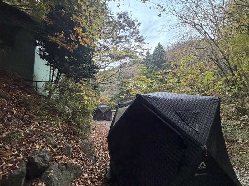 サウナテントは川を挟んで全部で7基。1番上のテントは滝壺のすぐ脇。