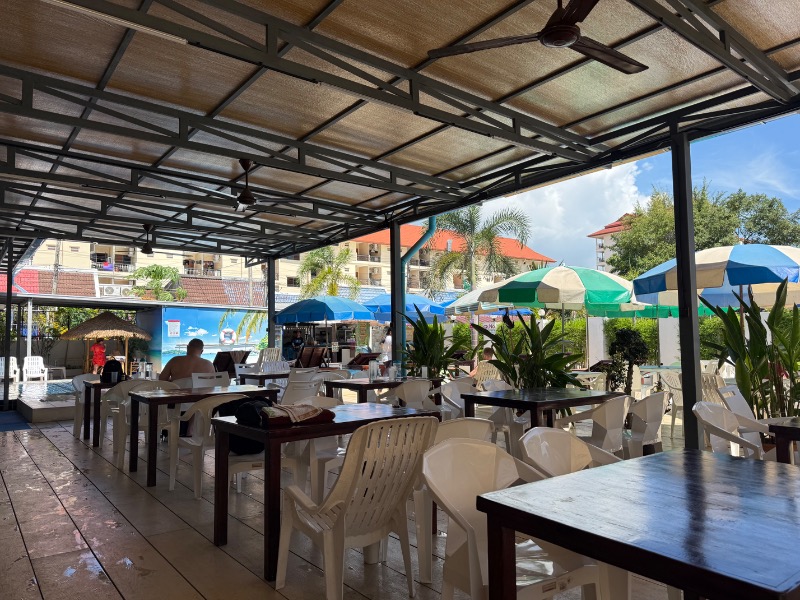 サ飯は、ここにくる途中で食べたガパオライス 120THB。パタヤビーチを眺めながらの食事が最高。