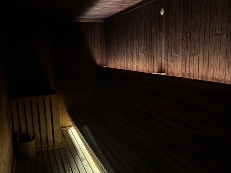 サ室は濃い茶色の木製の造り。温度はしっかりとあり、セルフロウリュも可能だ。