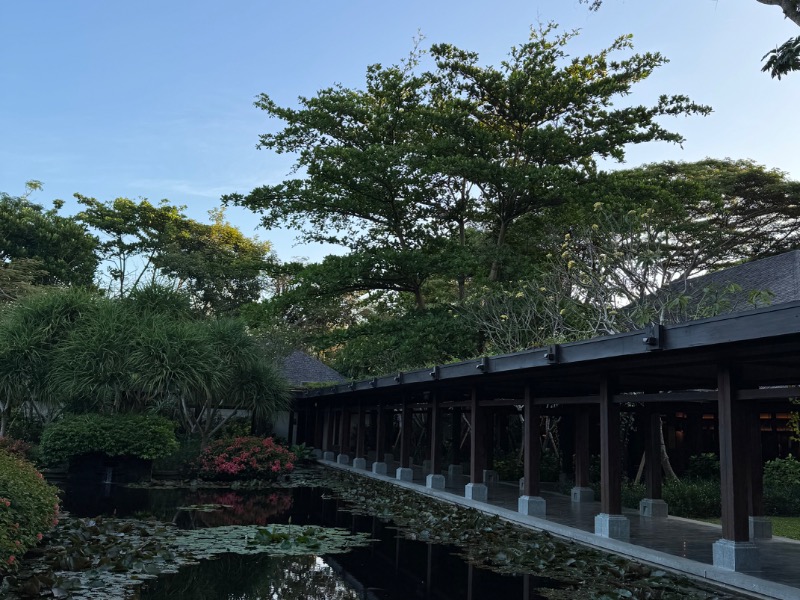 ホテルの西側に立地するSpaは草木繁る通路を歩くと現れる。木と石の上品なデザインに南国らしい水景と植栽、クオリティの高い施設だ。
