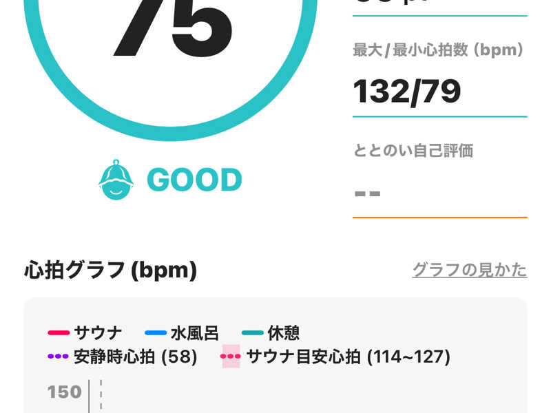 ドライサウナは75度、スチームサウナ40度と低めの温度設定だが外は30度越えなのでちょうどいい。