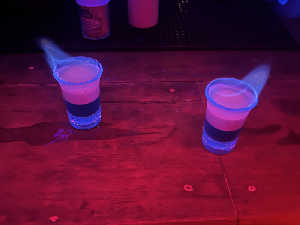 席に着くと無料のフルーツとお茶、かき氷の苺シロップ味の赤い炭酸ジュースが配られる。新鮮!