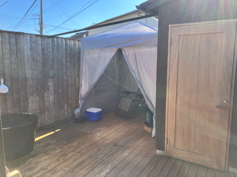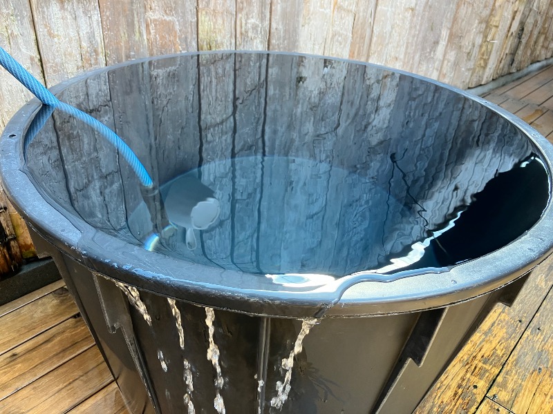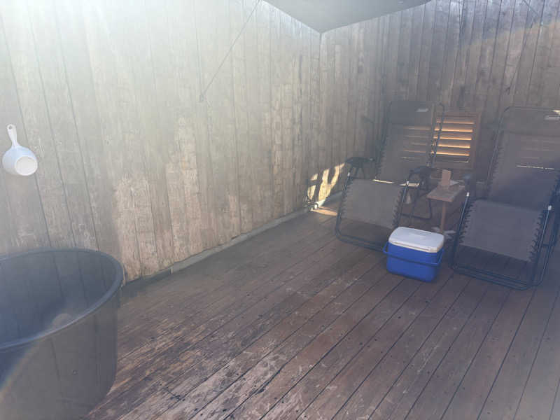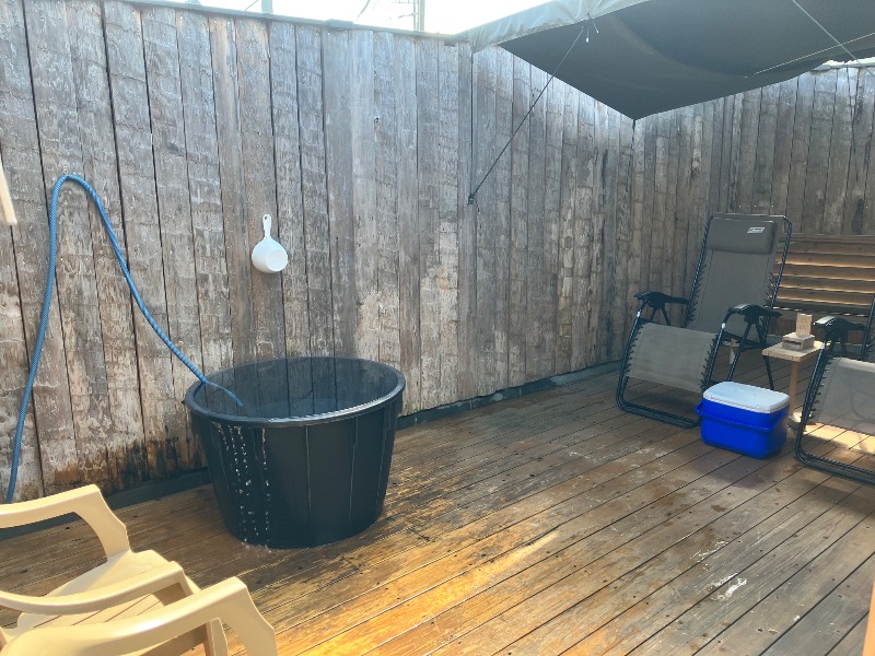 サ室を出たらバスタブ水風呂も可能だが、屋外ウッドデッキにある大きな1人用露天水風呂!