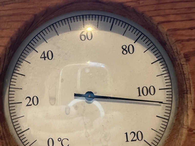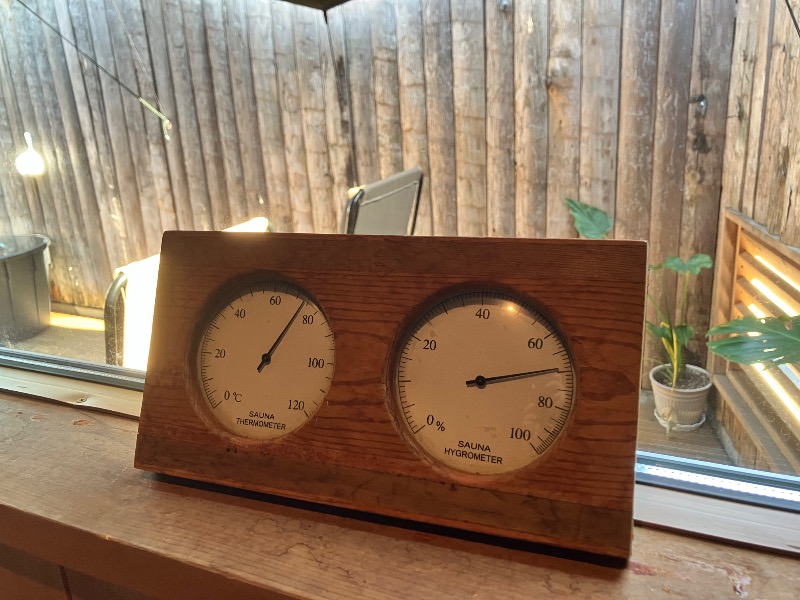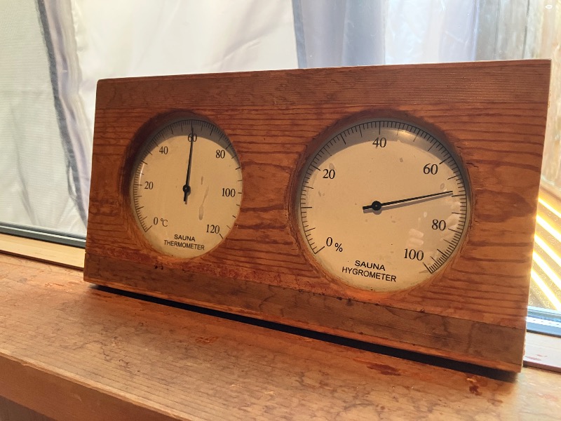 薪を足さず次第に温度は下がっていき、温度計80℃近くになる頃には、ロウリュの蒸気のみで長く心地良い熱さと湿度で楽しめるからたまらない。