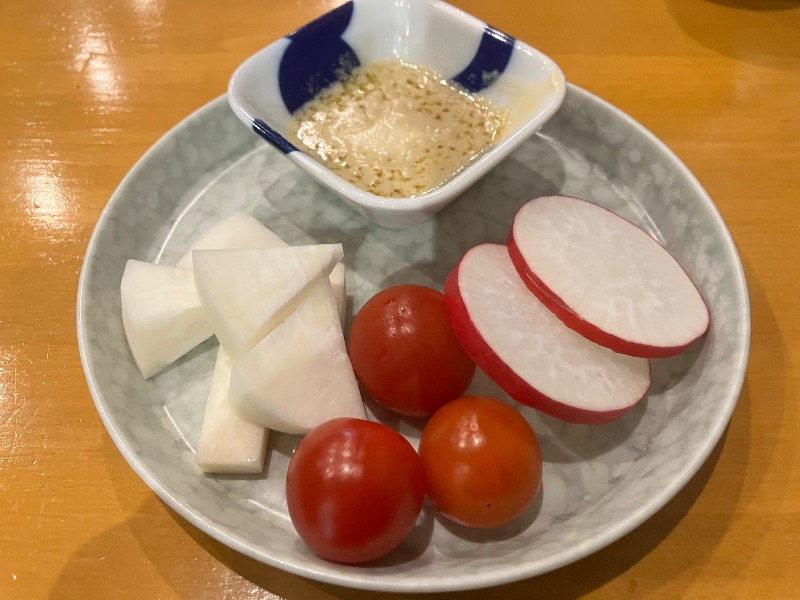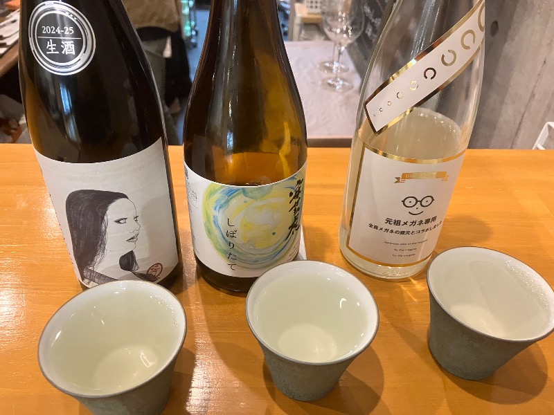 珍しい日本酒3種飲み比べとじゃこと大根葉のちぢみをアテに、ワインとバーニャカウダーも。