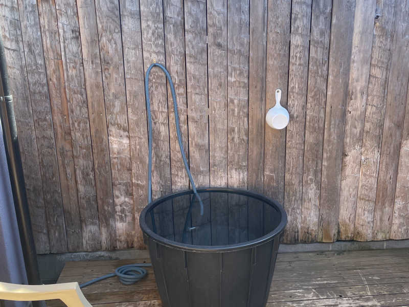 サ室を出たらウッドデッキの大きいバケツ水風呂!
