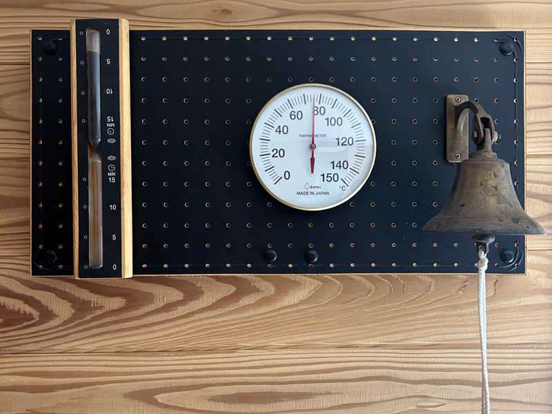 壁には15分計。温度計は100度オーバー。そこまでの体感ではないがロウリュをすると……じんわりと熱が降り注ぐ。自分で仰いだりして楽しむ。10分弱。