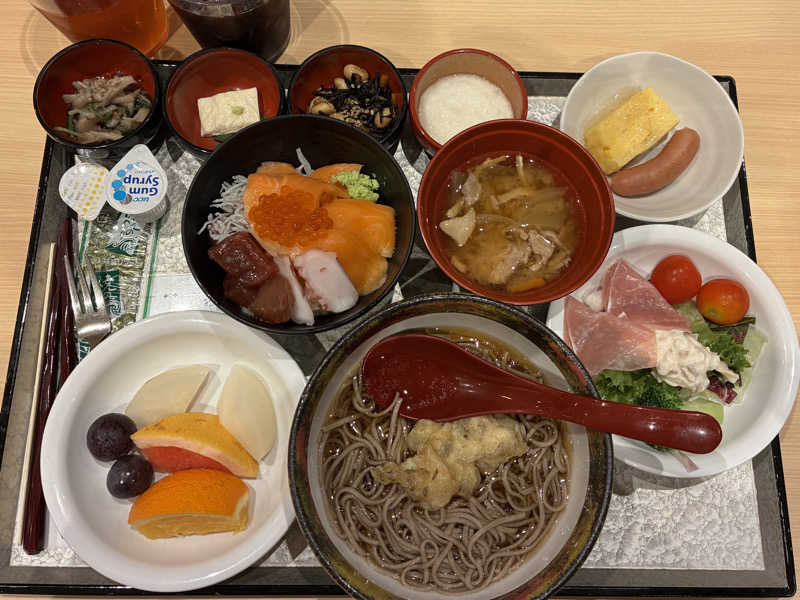 一言:ホテルサウナがある場所にくると、驚くほど快眠爆睡で早朝目が覚めてしまうのだが、ここのベッドが硬さが自分の体にあっていて、更に質の良い睡眠が得られた。窓をあけると、あんなに騒がしかった浅草が嘘の様な静けさ。花やしきもストップウォッチでもかけられているかのよう。am7:00ライドオン!何故こんなに遅いかって?今回のプランはチェックアウトが13:00プランだからだ。3時間違うだけでかなり余裕がある。浴室内は昨晩と違い、お姉様サウナーがわんさか。でも、不思議とサ室内でバッティングすることなく、ソロサウナ堪能できました。昨晩より日が差し込むかなと思いましたが、やはり浴室内露天スペースは暗いです。サウナに集中できるからむしろこの暗さがいいかも。サウナは相変わらずかなりの熱さです。でもカラカラサウナではなく、湿度がしっかりあるため、息苦しさはありません。お風呂から上がったら、マッサージチェアぜひ試して下さい。ここのマッサージチェア、凄く気持ちがいいです。特に絶妙な足裏のマッサージ最高です。その後、食事へ行けば動線バッチリです。