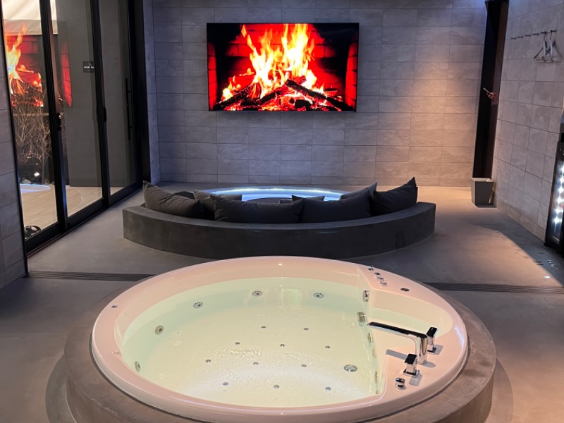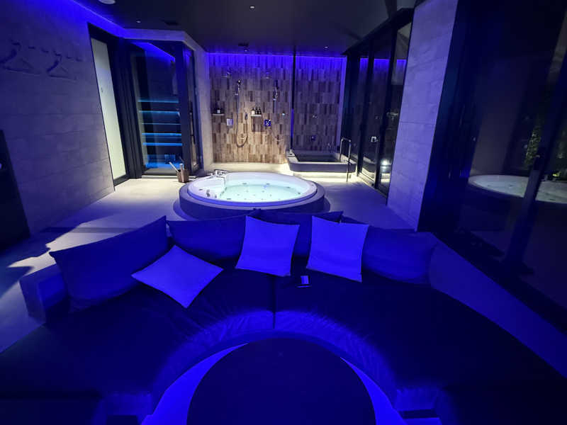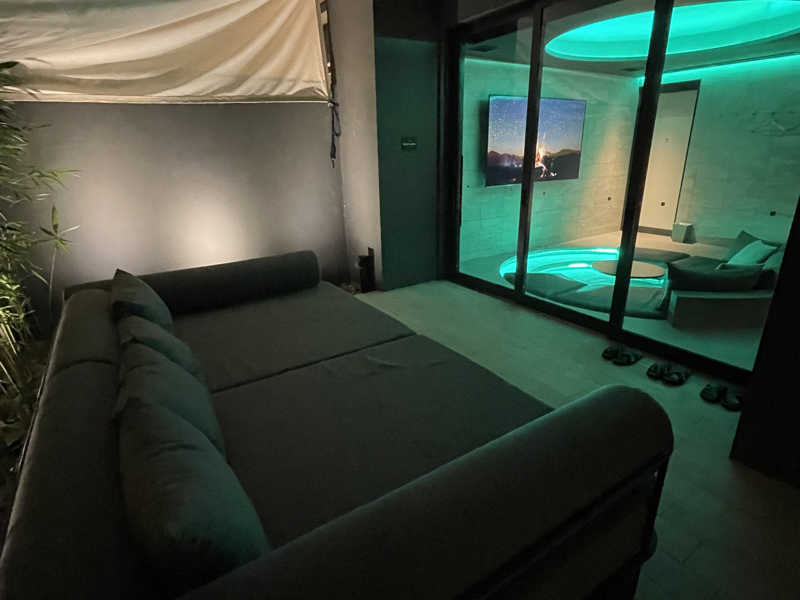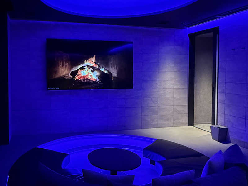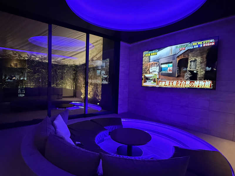 外気浴エリアの大きな窓ガラス外に明るく吹き抜けの空間に、YouTubeで映像が流せる大画面スクリーンを前にカラーライトの彩光が眩い円形の広いソファ席。