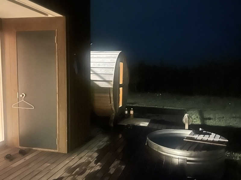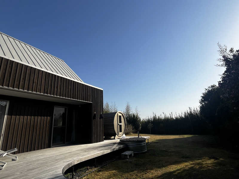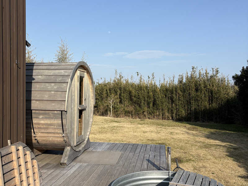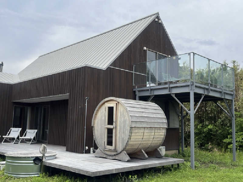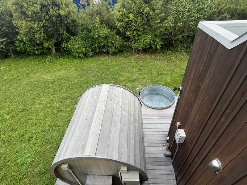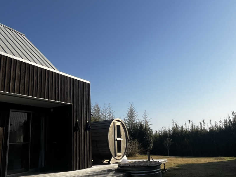 広々としたテラスにバレルサウナと水風呂が設置されていて、波の音や空の広さを感じながら整える‼️