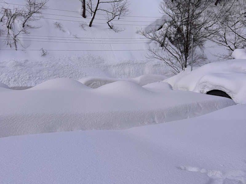 先ずは●雪の量が尋常でない。DENまでの誘導路は車線が半分しかなく、対向車とのすれ違いは不可。なのでDENも画像のとおり、店舗母屋から各サウナ設備までほとんど雪に埋まっていました。