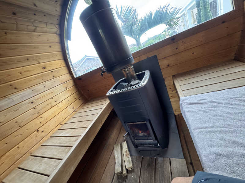 ・サ室は詰めて4人入るだろうか。奥になんと薪ストーブ。熱量足りなかったら好きに薪を焚べて良いらしい。ストーブ上方に水タンクがあり、ラドルに給水してセルフロウリュも可能。温度は最初80℃台後半だったが、94℃くらいまで上がった。このサ室がすごく良い。薪ストーブの柔らかい熱は離島でもいい感じ。