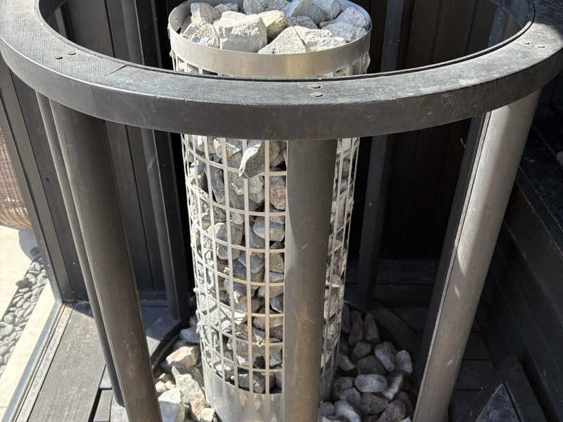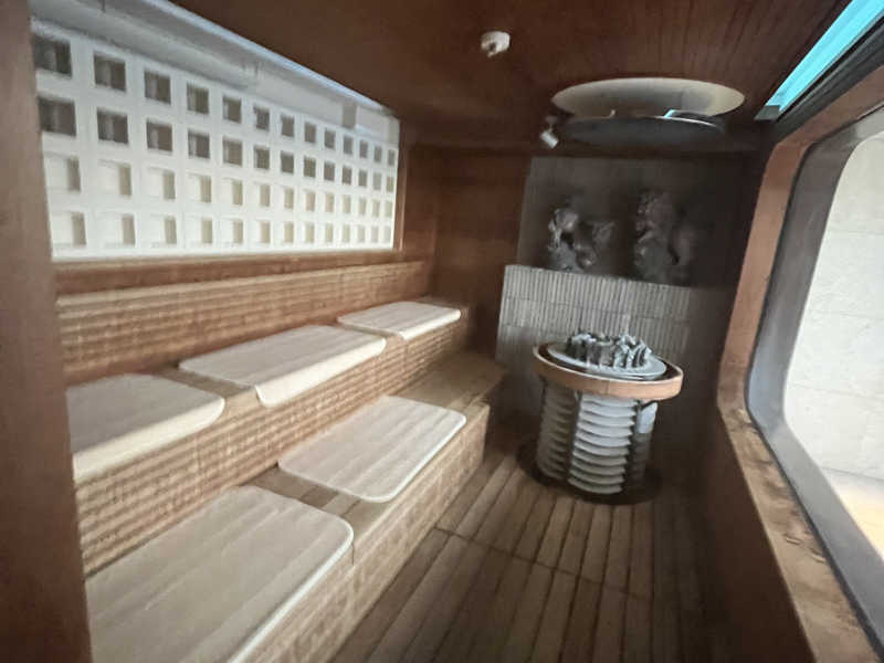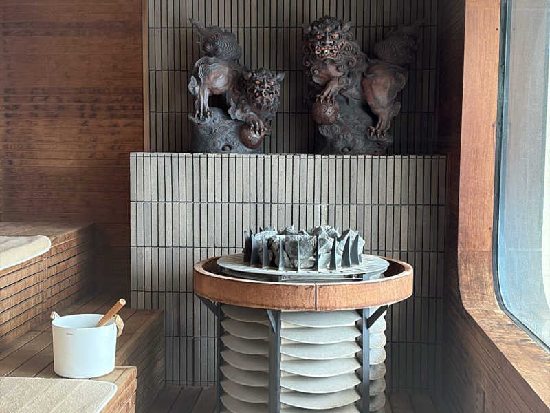 サ室は82度から84度くらいで、セルフロウリュウ可能。置物のシーサーの口からのオートロウリュウもあって、温度計よりも体感熱くてよい