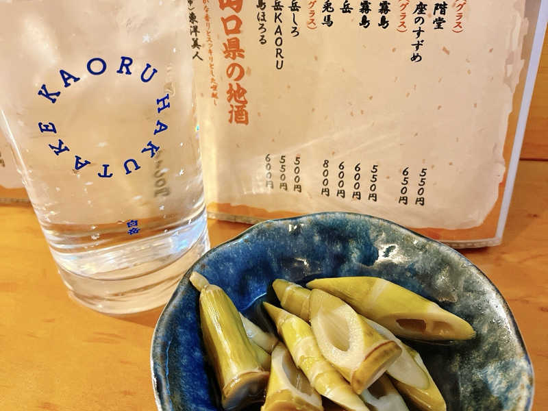 生ビール×2、お通し(おから和え、お魚南蛮漬け)、おばんざい(エビたまごマヨデリサラダ、サバアクアパッツァ、ししゃもえのき豆苗梅和え、四角竹の煮物)、鹿野豚塩焼き、防長鶴(周南市)、白岳KAORU水割り