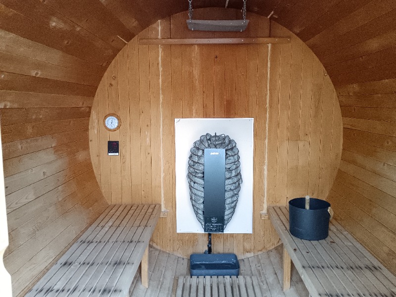 真新しい宿泊施設で受付を済ませてバレルサウナとプールの場所を案内されたら水着に着替えてサウナ🧖