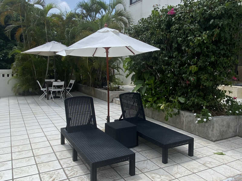デッキチェア2脚が2箇所。他は椅子。