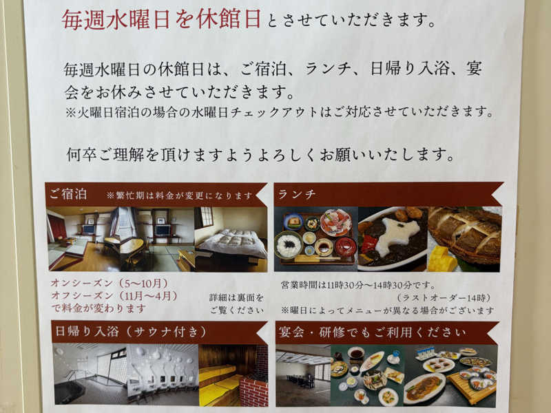 悠林館さん、オフシーズンなので3月か4月くらいまで水曜日を定休日にするそうです。