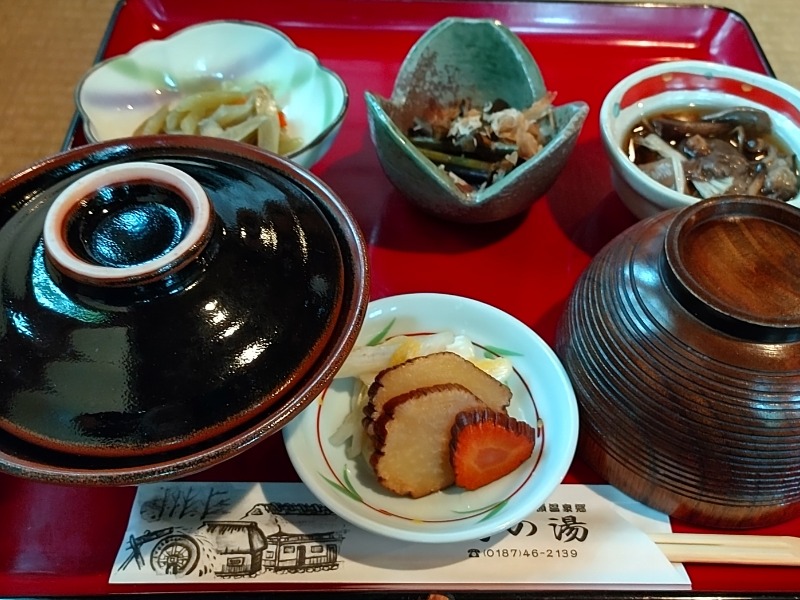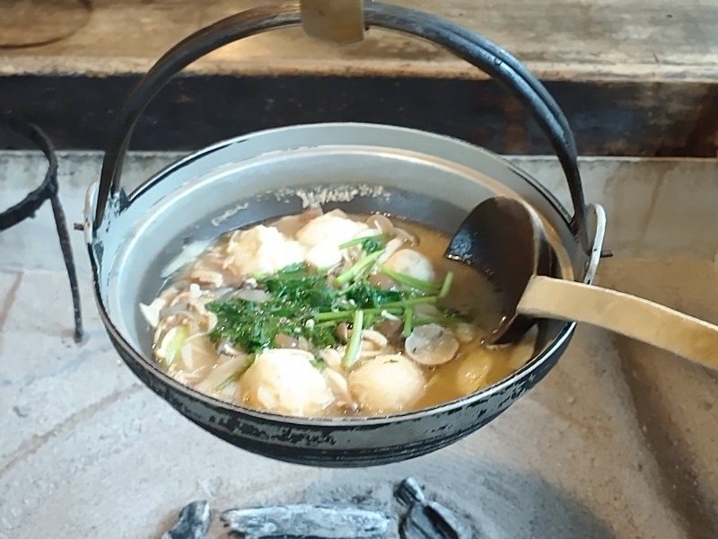 サ昼めし、鶴の湯の別館「山の宿」の庵(いおり)で山の芋鍋定食。お膳に米とお新香と山菜の小鉢3品。囲炉裏に鍋という高級ランチ。1,550円。鍋は約3杯分の量。ごっちゃんです(´(ェ)`)