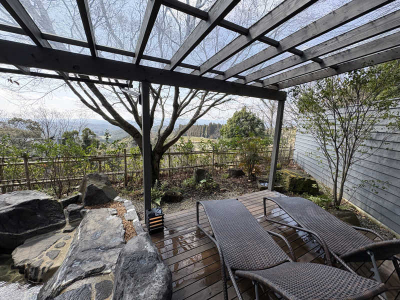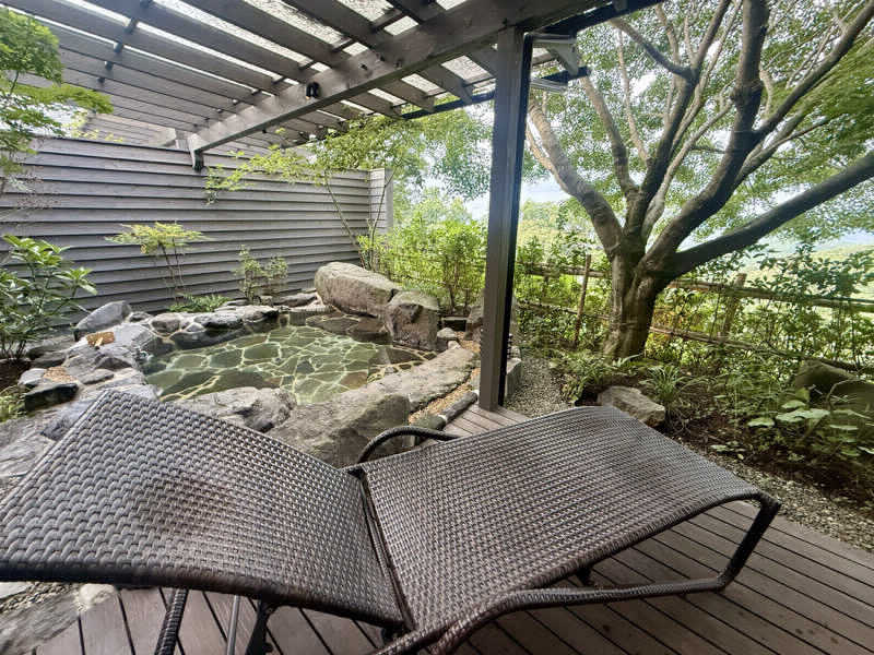 外気浴スペースからの景色は霧島の茶畑や森、そして桜島も眺望できるのでとてものどか。