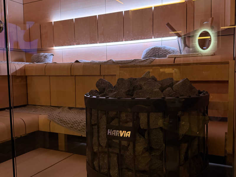 受付の感じのいいお姉さんの案内で部屋に入ると、そこは透明ガラスのサ室がある贅沢空間。サ室が透明なので自分の好きなNetflixやYouTubeを見ながらサウナもできる。うーん、ここに住みたい!