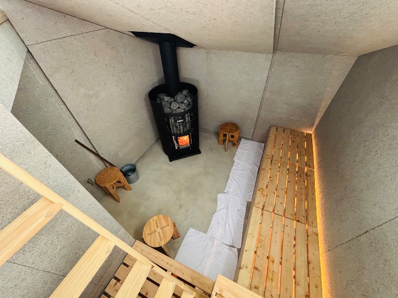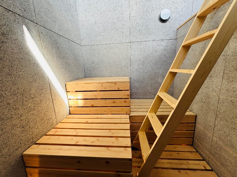 高低差を作り、座る場所によって温度の違いを楽しめる作りになっています ハシゴを使って上がる席は温度も高く、特別な光が差し込む神々しい空間 暗い室内に、高い場所に設置した窓からの自然の光が入り、時間や季節によって異なる雰囲気を楽しめます サウナ初心者や苦手な方も楽しめる、息苦しくないサウナです ロウリュを楽しみ、リラックスしながらお入りください
