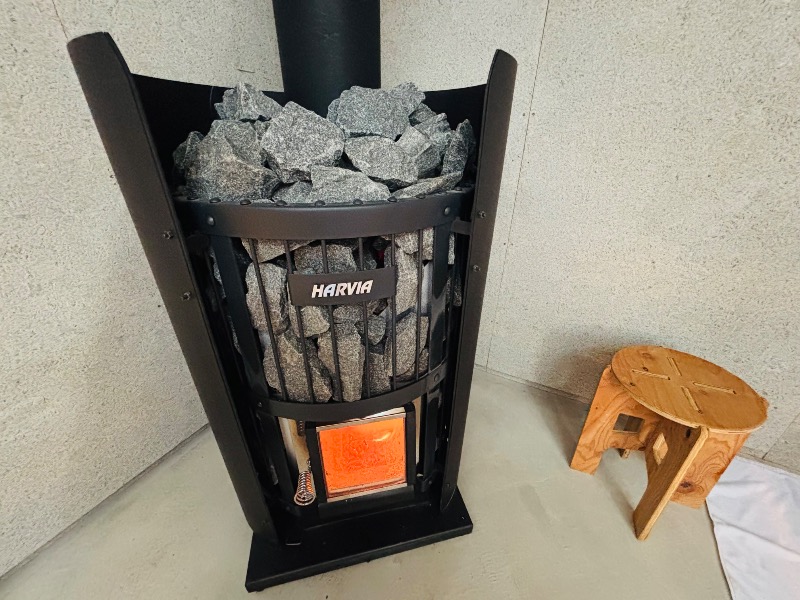 ハルビアのデカめのストーブが鎮座。高低差がこれでもか!とつけられたサウナ室。非常に面白い造り。