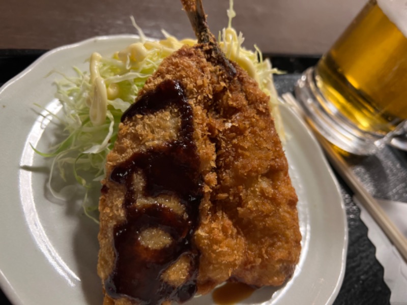 超特大のアジフライ(ガーリック風味)の半身に醤油、ソースをかけてがっつりいただきました。 うまー!