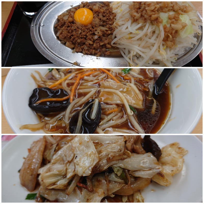 ラッコ飯(背脂、野菜増し) 小盛サイズのサンマーメン 野菜炒め