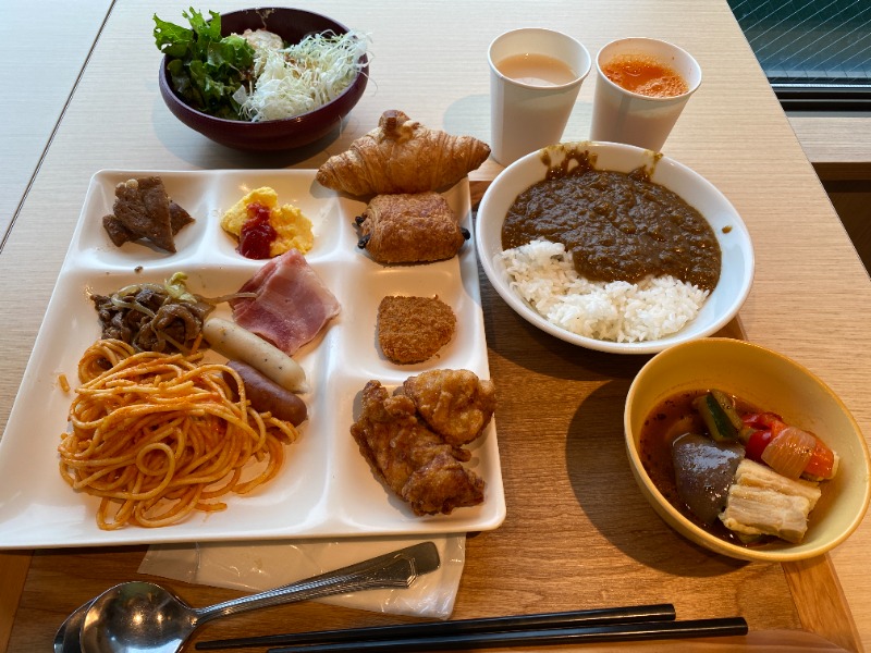 朝食会場が9時半までのビュッフェ形式なので、早者勝ちの料理もあるだろうと、朝風呂の前に"あサ飯"をいただくことに