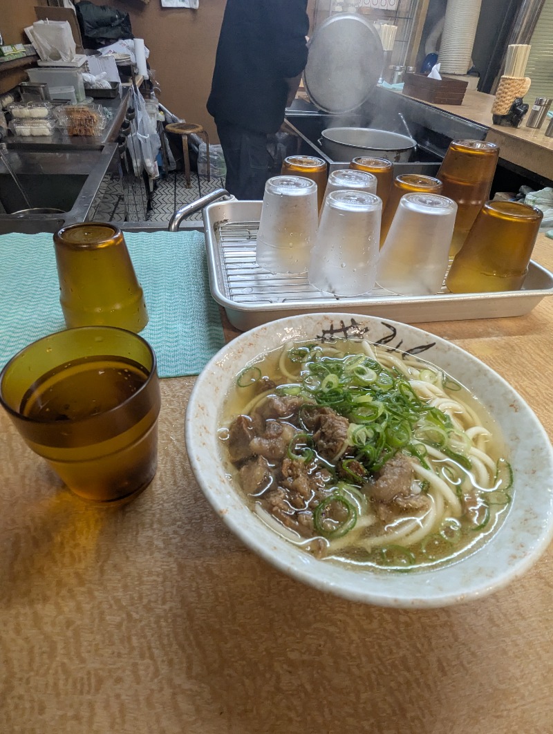 駅に降りた所の名物立ち食いうどんのたつのでぼっかけうどん。うまい!