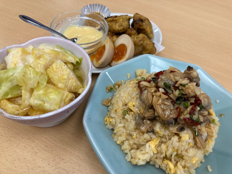 大広間には結構人が。いつものようにあさり炒めと玉子チャーハン。