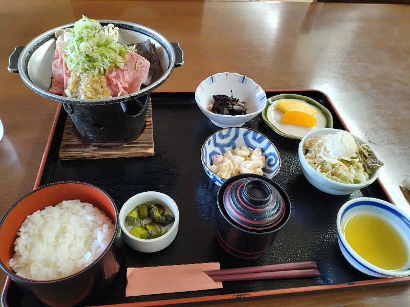 風呂上がりに昼飯で飛騨牛朴葉みそ焼き定食をいただく