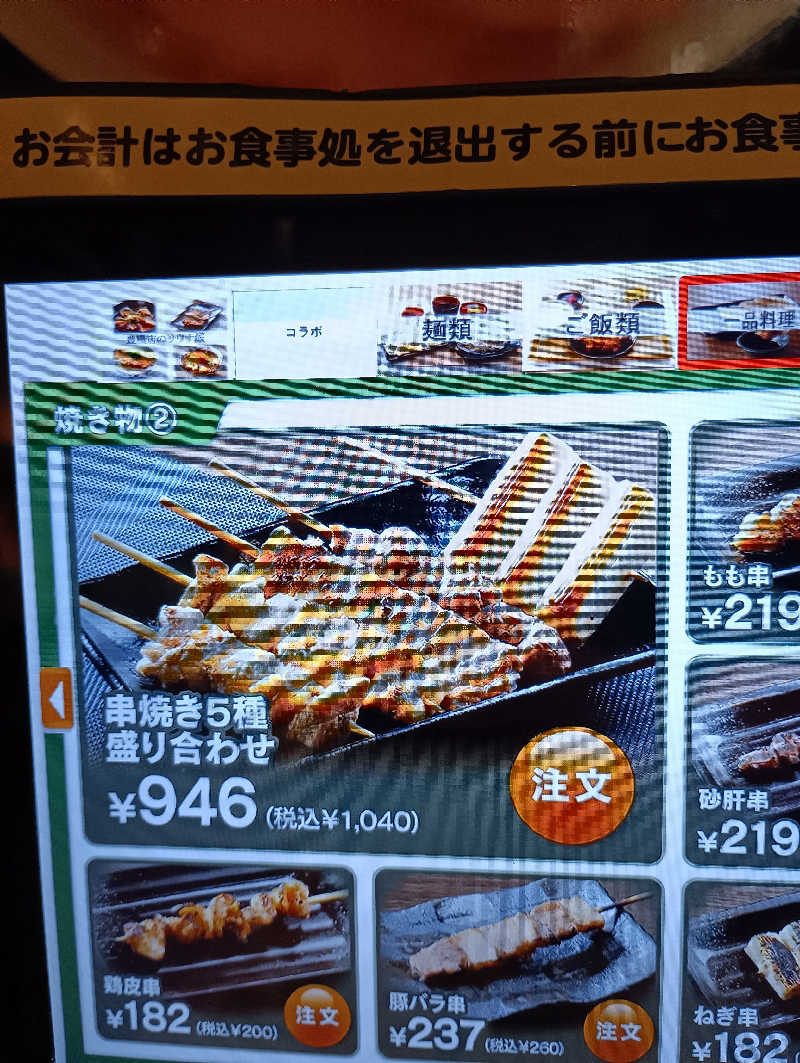 風呂上がりにリポスパと海藻グリーンサラダ、串焼き盛り合わせ5種をいただく