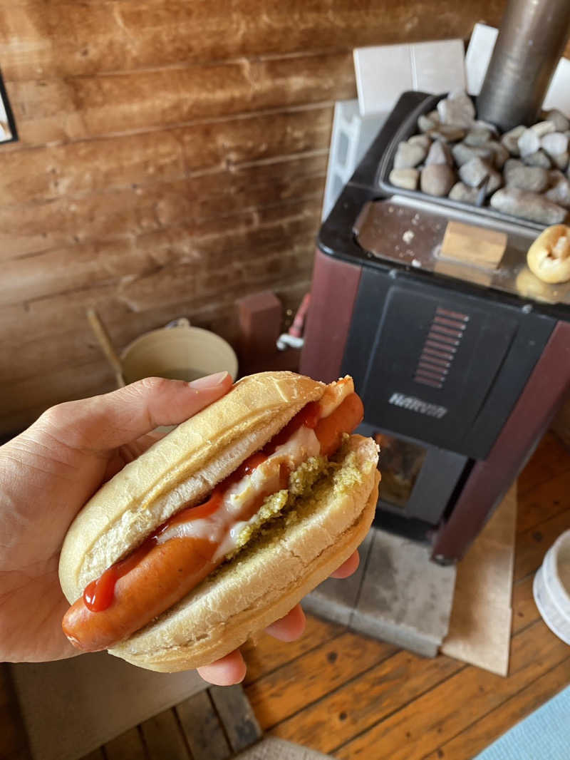 途中フィンランドの森に寄ってソーセージやパン、チーズ、タプナードソースを買って、サウナ小屋の中で食べる🌭