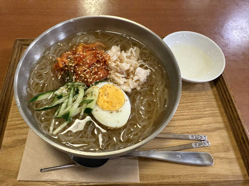 女性サウナ室が故障中ってなってたけどカラッカラな感じで温度は暑かったからちゃんとととのった!!! サウナ室は11日に修理するらしく目処が立って良かった〜 今日から夏メニューになってて冷麺🙌