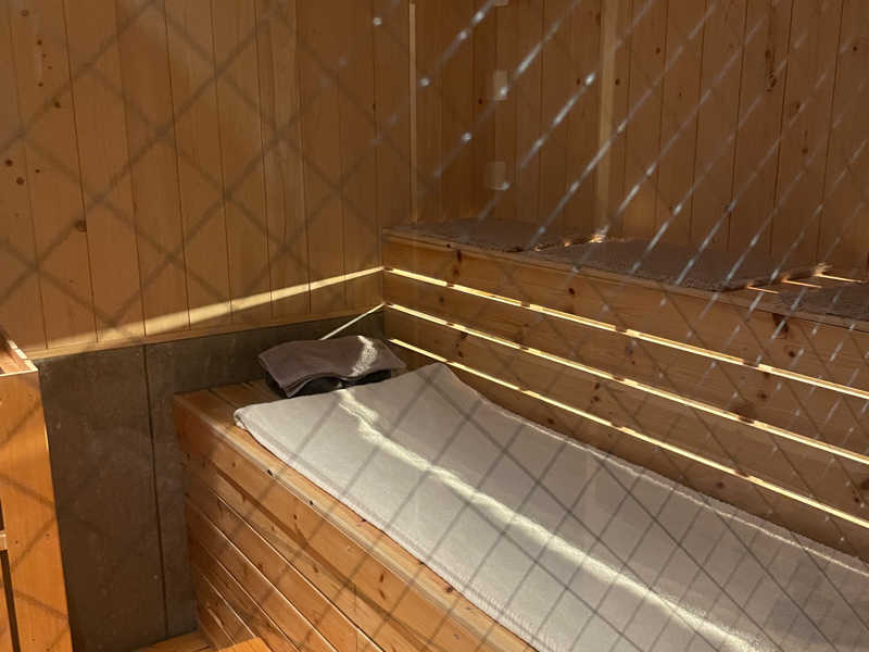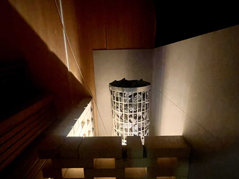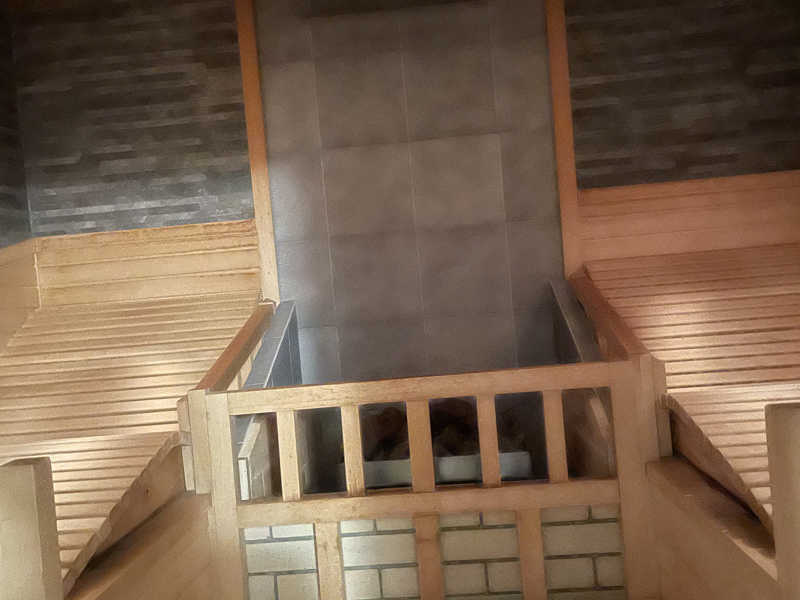 水風呂のミストは、屋外施設で小雨が降ってたらこんな感じだよな、という既視感あるものでしたが、サ室内のミストは新感覚でした!通常時はドライサウナですがボタンを押すと天井からミストが噴射されます。最初は熱めのシャワーを頭から浴びてるような感じでしたが、ロウリュウ効果と合わさって体感はかなりの高温に。1回で15秒くらいは続いたと思います。ミストが止まってからも空気中の水分がストーブに落ちるような設計になっているのか、しばらくオートロウリュウ状態でした。