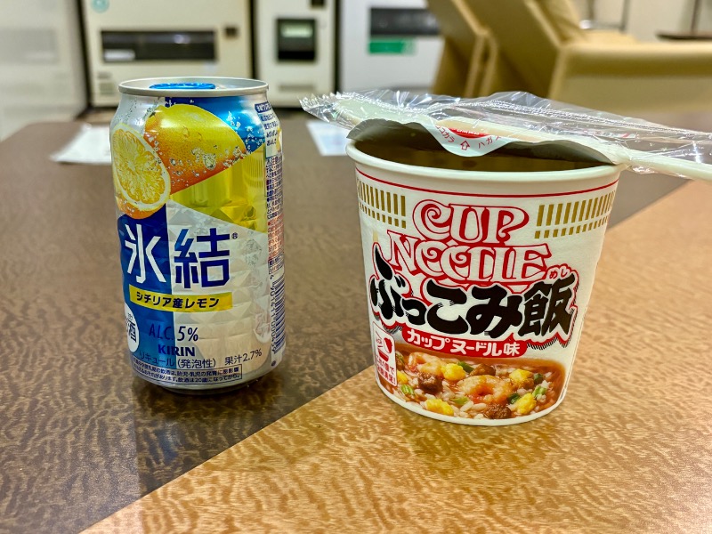 レストランは23時で閉まっていたので、フロントでカップ麺と氷結を買い、休憩室で晩酌して就寝。