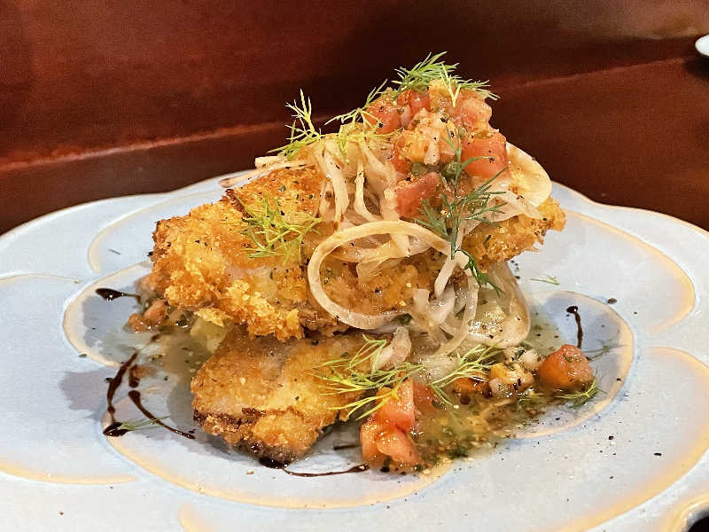 季節の素材が絶品ソースを纏い、ワインと好相性のメニューに。アジフライも生姜風味の焼き茄子とフレッシュトマトのソースで別世界の逸品になりました☆