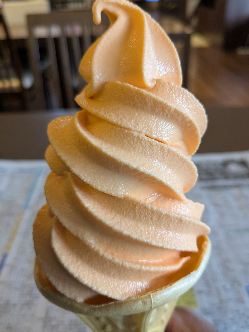 9時ポイント使用で無料入館🤭 さすが平日月曜ガラガラ状態😇 家族連れも若者軍団も居ない平和だった😇 サウナ86度でも熱く曇り空の外気22度で そよ風吹いて少し寝た😪 限定ソフトクリーム北海道メロン(380円) 口溶け滑らかメチャクチャ美味い!!😋 11時30分退館👋 83