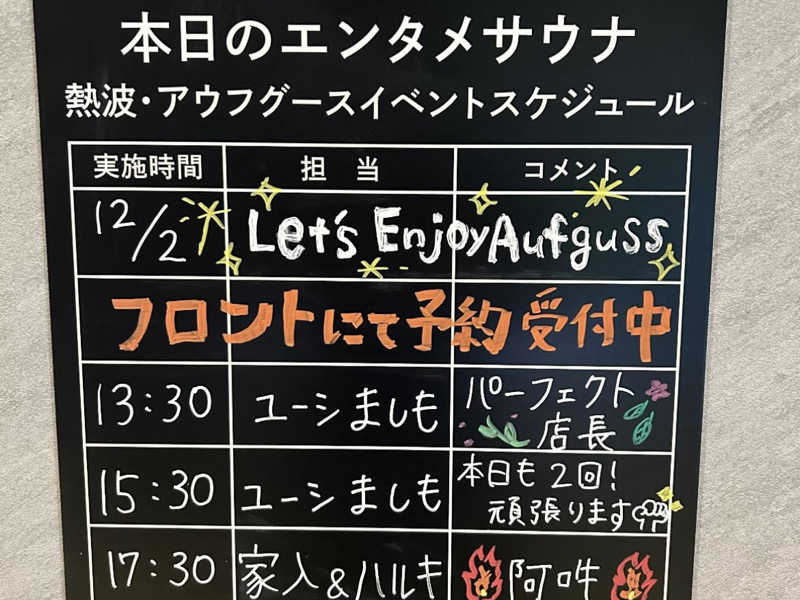 2セット目は15時半からのアウフグース。店長さんのユーシましもさん回。満員。50人近く入れる5、6段くらいあるんじゃないかな?満足。