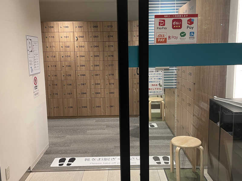 土曜の12:30に入店し、動画で説明を見た後、バスタオル2枚、床タオル1枚、外気浴用ポンチョを取り、持ち物多めでロッカーに向かいます。