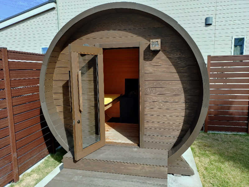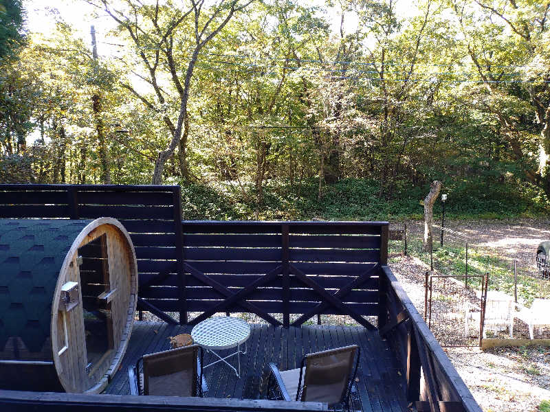 那須の自然に囲まれた中にある、1棟貸タイプのコテージに設置されたバレルサウナ。